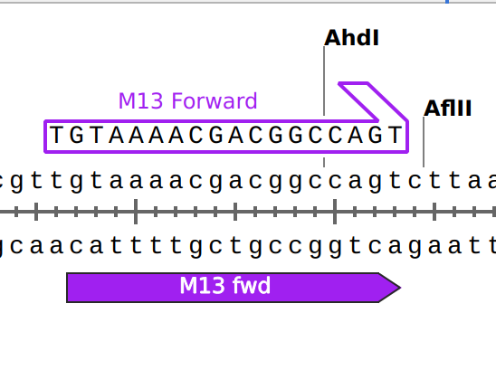 Зверніть увагу, що праймер повинен дивитись у сторону вашої кодуючої послідовності, У SnapGene це відображається як фіолетова стрілка у відповідному напрямку, де початок стрілки вказує на напрямок синтезу: